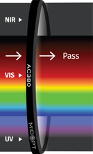 Acrylic Longpass Filters are frequently used for lens protection and economical enclosure windows, as well as over light sources to control the wavelength emission of broad spectrum light sources. Because of their durability, they’re commonly used in Food & Drug Administration (FDA) and European Food Safety Authority (EFSA) regulated applications where glass over the inspection area is not permitted. AC370 and AC380 offer anti-abrasion, anti-reflection coating, which can also withstand harsh solvents such as alcohol, acetone or MEK.