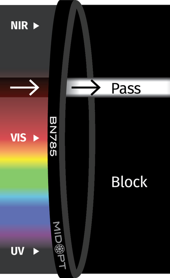 APPLICATIONS: BN Series are popular in factory automation applications where overwhelming ambient light (sunlight) may be present and in fluorescence applications to prevent cross-talk, while blocking excitation illumination and ambient light. NIR BN filters are commonly used in outdoor applications such as security surveillance and license plate recognition.