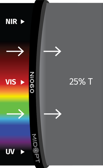 MidOpt Neutral Density Filters serves as “sunglasses” for your system and can be used with monochrome or color cameras. Designed to reduce light intensity neutrally over a specific wavelength range without affecting image color or contrast.